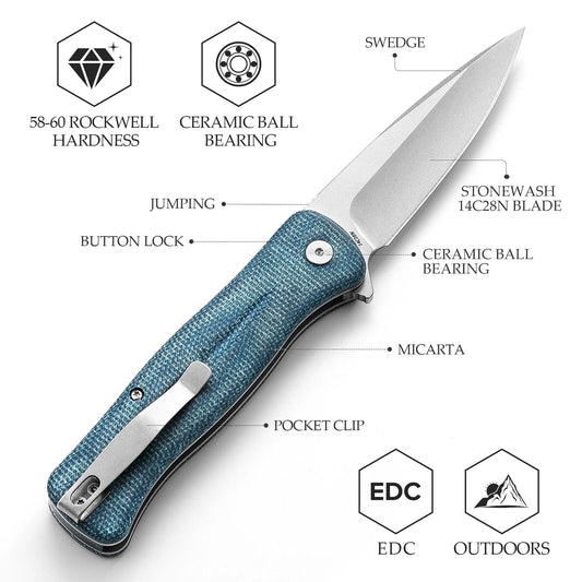 TRIVISA Dor-04Bu Button Lock,3.66" 14C28N Steel,Micarta Handle